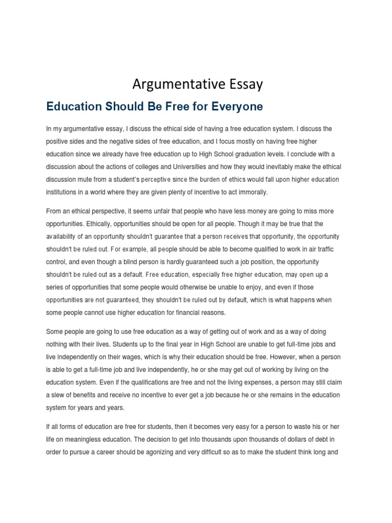 Good Argumentative Essay Examples And Writing Tips from www.myperfectwords.com Yes, some students, parents, and educators say that it is completely wrong for a person to attend public schools for free and now have them pay for college. Colleges should not be free because the government will use taxes to pay for the college, college is a crucial period where people learn how to handle their finances, and the economy would most likely collapse if colleges were free. The banks are using students as profit makers and the government is doing nothing about it. Some agree that college should not be free since some students will be unmotivated, lazy or unconcerned about their education. Capable people are born in equal measure, just like families, able and willing to pay for the fees and low income in large families, where fees can be onerous. The prospect of making college education completely free for all students is one that could carry many obvious benefits. College should be free for people who have low income like middle class and lower class because everyone cannot afford college. See college just would not be free out of nowhere, they still have to pay for it somehow.